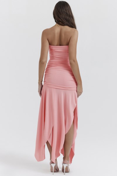 Our 'Ivana' dress is beautifully cut from a summery apricot stretch jersey and has a strapless neckline that's gently gathered throughout the bodice to below the hip for a flattering silhouette and features our incredible corsetry boning to cinch the waist.