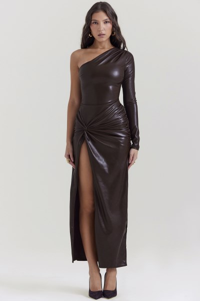 Our 'Octavia' dress is ultra chic and sexy. It's the soft buttery vegan leather and high split that makes 'Octavia' our kind of favourite. Gathered into soft folds with a twist at the front, it has an asymmetric neckline and a flattering maxi length. The figure cinching inner layer creates generous stretch and it zips to the side for easy on. Wear yours with tonal pumps like our 'Paris' in brown.